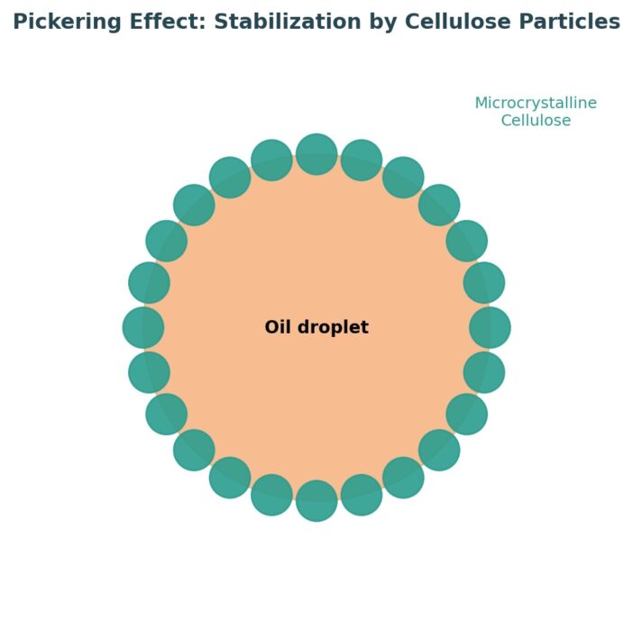- Special feature: Microcrystalline cellulose works via the so-called Pickering effect. Solid particles accumulate at the interface between oil and water, stabilising the emulsion without the need for large quantities of traditional emulsifiers. This results in a particularly natural and robust stabilisation of O/W emulsions.