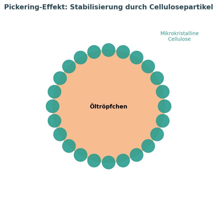 - Besonderheit: Die mikrokristalline Cellulose wirkt über den sogenannten Pickering-Effekt. Dabei lagern sich feste Partikel an der Grenzfläche zwischen Öl und Wasser an und stabilisieren so die Emulsion, ohne dass klassische Emulgatoren in großen Mengen nötig sind. Das führt zu einer besonders natürlichen und gleichzeitig robusten Stabilisierung von O/W-Emulsionen.